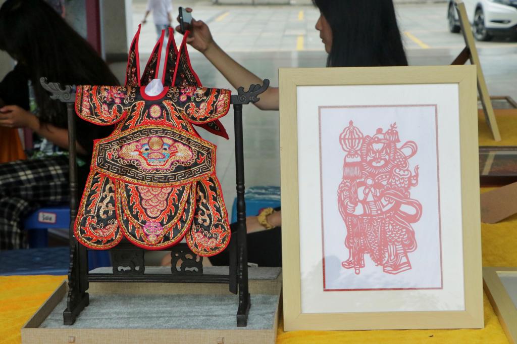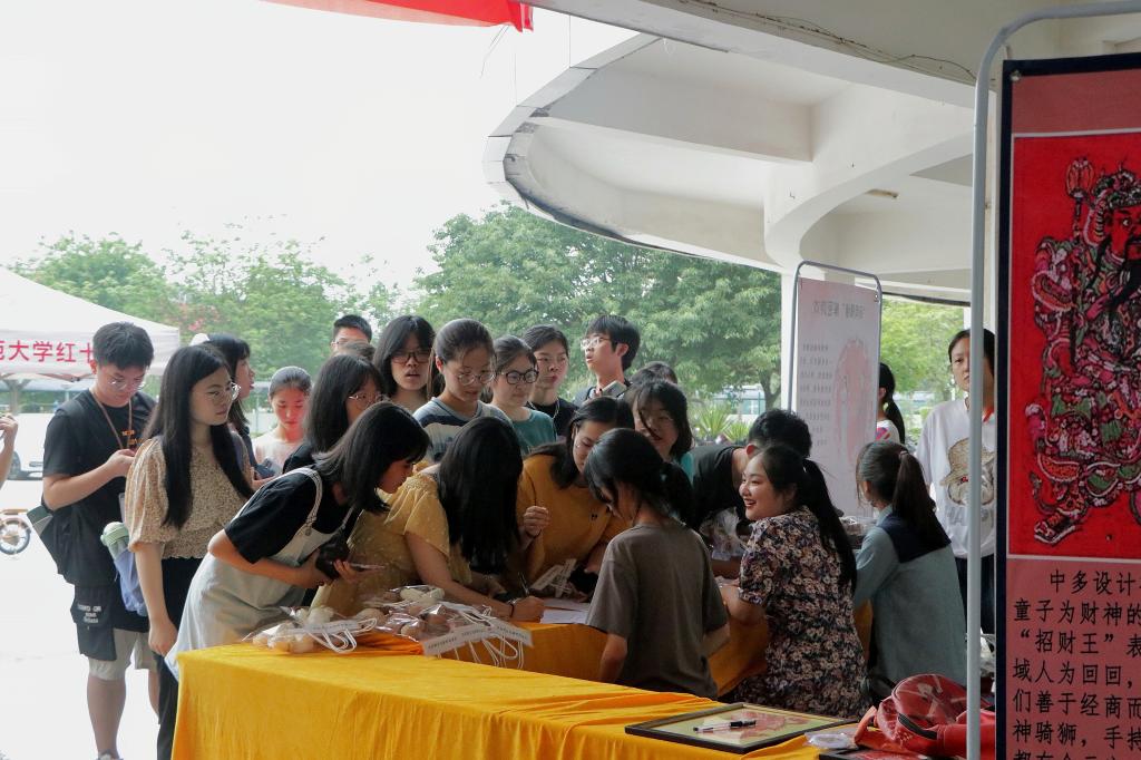 活动现场设有非物质文化遗产展示区、答题区和夜市区,展品内容丰富,活动形式多样。在非遗展区,剪纸作品《不忘初心》、漳绣作品《漳绣战甲》《国宝熊猫》等闽南特色非遗作品让观众在领略精湛技艺的同时,感受红色文化熏陶。在答题区,“全能学霸”“爱拼才会赢”“趣语在闽南”“慧眼识闽南”“缱绻芳华”五大主题活动热闹开展,参与者在愉快答题体验中学习党史知识,了解地域文化,重温党的百年辉煌奋斗历程。夜市区则有精美文创产品供同学们观赏。