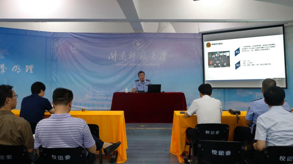 本次会议邀请漳州市网安支队副支队长毛庆辉作题为《网络舆情意识与引导实务》的专题讲座。讲座中,毛庆辉副支队长从网络舆情的概念入手,深入阐述了新媒体环境下高校网络舆情的内容、高校网络舆情引导存在的问题,并结合舆情引导的典型案例分析,对学校如何在新媒体环境下提升网络舆情引导水平提出了对策和建议。