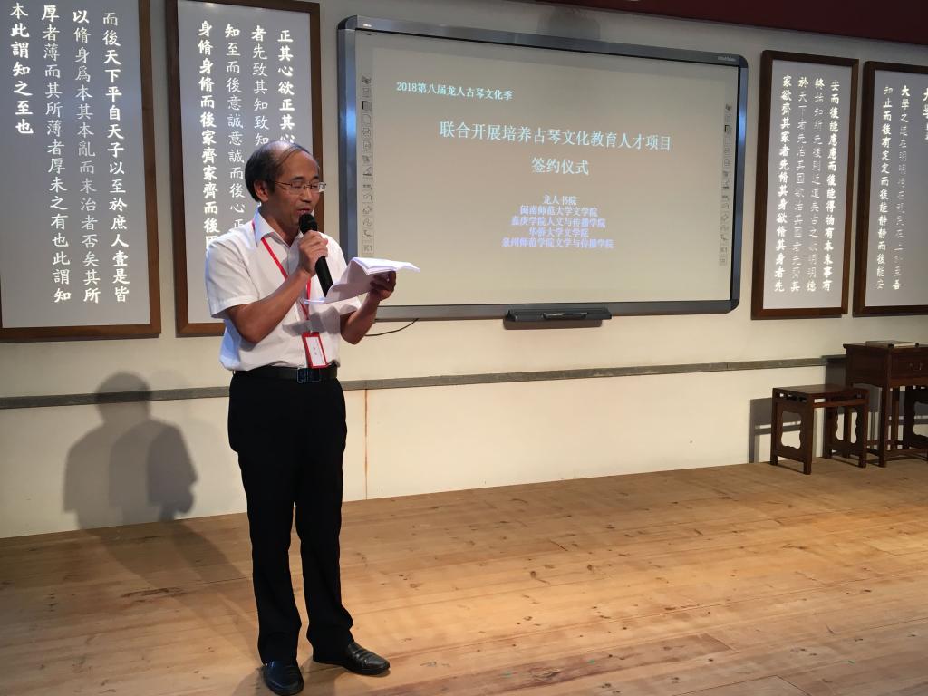 漳州市委常委、宣传部长刘伟泽,中共福建省委外宣办处长郑东育、龙人古琴创始人谢建东分别在仪式上致辞。启动仪式上,登录入口继续教育学院、厦门大学嘉庚学院人文与传播学院、华侨大学文学院与龙人古琴设立教育教学基地及授牌,并举行了龙人书院与登录入口文学院、厦门大学嘉庚学院人文与传播学院、华侨大学文学院、泉州师范学院文学与传播学院联合开展培养古琴文化教育人才项目的签约仪式。