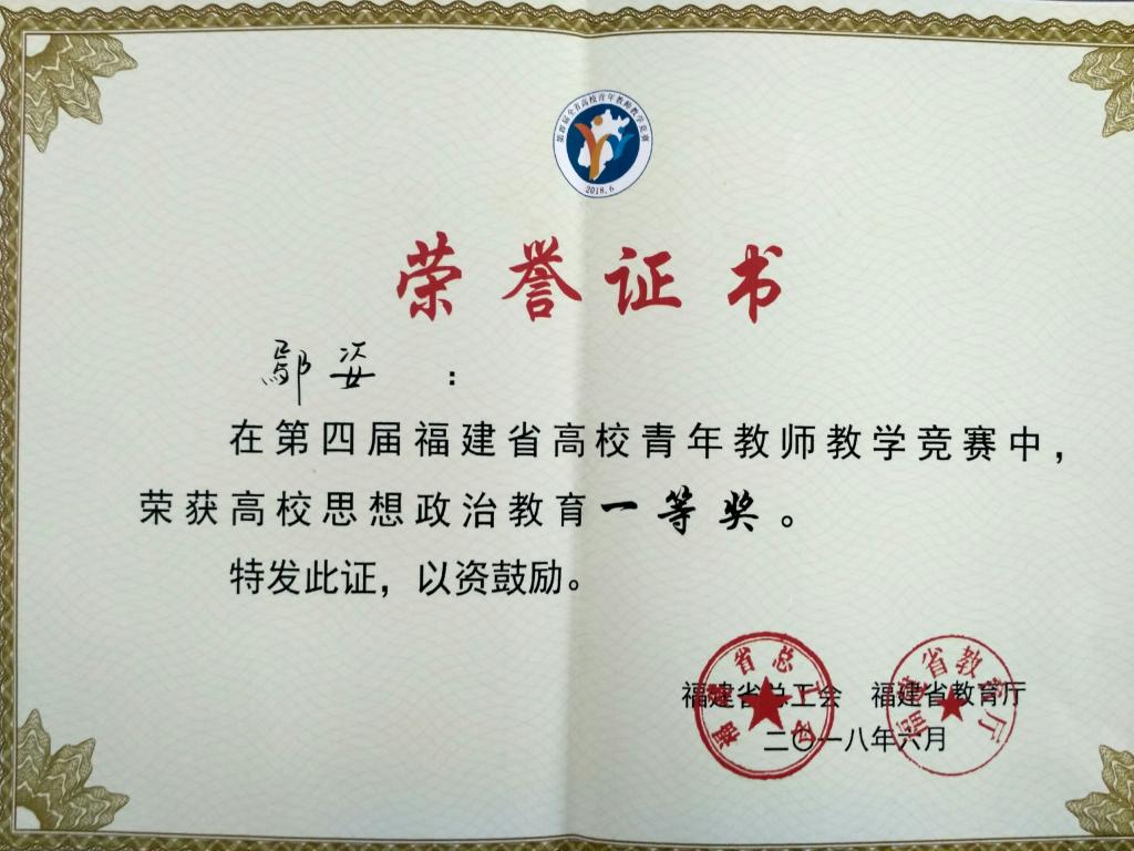 6月20日-23日,由福建省总工会、福建省教育厅主办,武夷学院承办,福建教育学院协办的福建省第四届高校青年教师教学竞赛在武夷学院举行。登录入口马克思主义学院鄢姿老师荣获思想政治学科一等奖,并被授予“福建省高校青年教学名师”荣誉称号。