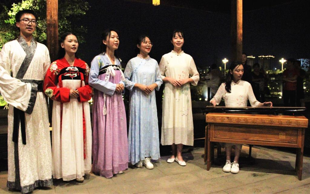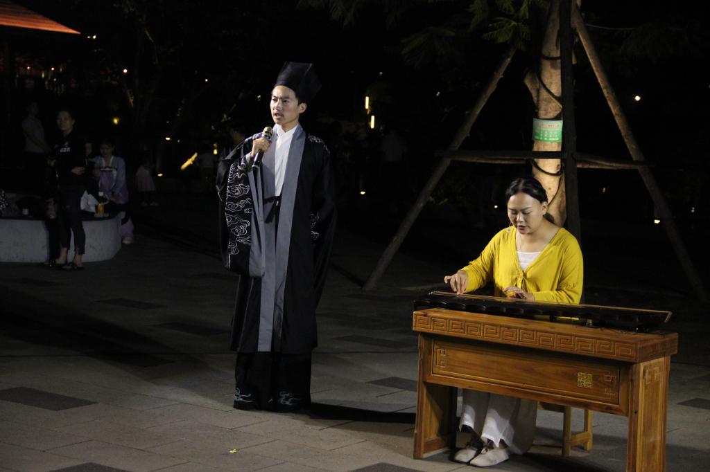 10月1日晚,在以“琴与歌”为主题的晚会中,泠泠琴音伴曼妙歌声远行,或婉转连绵、或荡气回肠。《酒狂》《叹香菱》《求索》《关雎》《归去来辞》《洞庭秋思》相续登场,琴曲相生,琴声抑扬顿挫,歌声细致婉转,赢得了阵阵掌声。