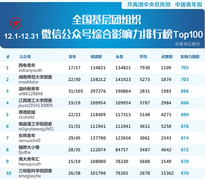 近日,根据共青团中央公布的全国基层团组织微信公众号综合影响力排行榜(2018年12月)、福建共青团公布的省内各高校团委微信综合影响力排行榜(2018年12月)显示,登录入口团委官方微信公众号“MK体育/mksport体育·官方网站团委”位居2018年12月份全国基层团组织微信公众号综合影响力排行榜第二名、福建省高校团委微信公众号排行榜榜首。其中,三篇文章入选全国基层团组织微信文章阅读量百强名单。