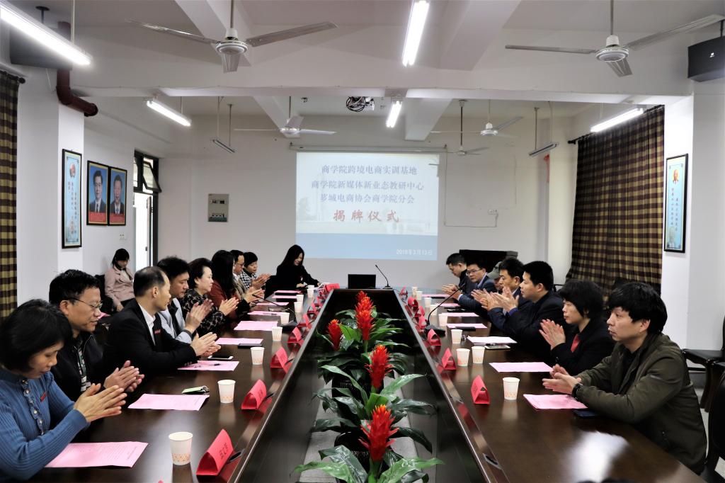 3月12日,商学院举行跨境电商实训基地、新媒体新业态教研中心和芗城区电商协会商学院分会揭牌仪式。校党委常委、副校长蒋一婷,金峰开发区党工委副书记罗进强出席揭牌仪式。校地办、商学院、芗城区电商协会等单位负责人,芗城区电商协会商学院分会成员及企业家导师参加活动。蒋一婷和芗城区电商协会会长黄志刚共同为跨境电商实训基地揭牌。