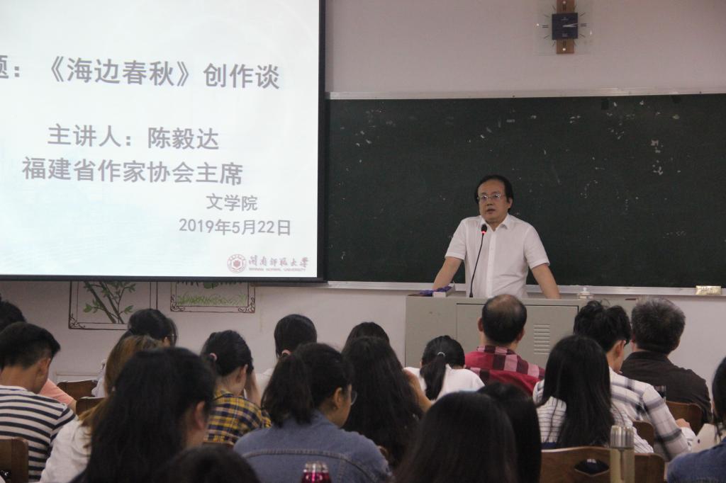 5月22日下午,应文学院邀请,福建省作家协会主席陈毅达在博文楼东区108教室为文学院师生作题为《<海边春秋>创作谈》的讲座。讲座由文学院院长黄金明主持。
