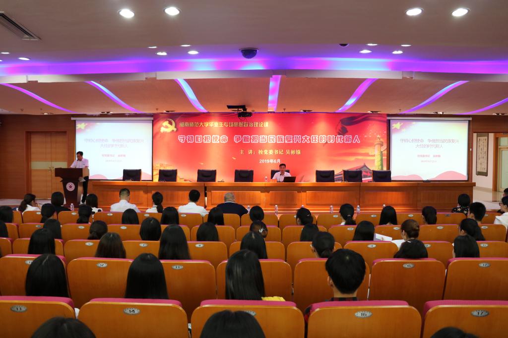 6月22日上午,校党委书记吴彬镪以《守初心担使命 争做担当民族复兴大任的时代新人》为题,在学校逸夫图书馆五楼报告厅为2019届毕业班学生党员上了一堂生动的思想政治理论课。