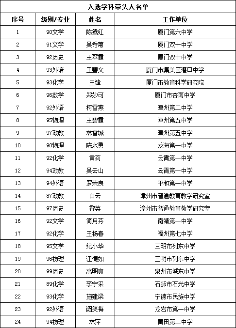 近日,福建省教育厅公布了省“十三五”第二批中小学学科教学带头人和名校长后备培养培训人选名单,登录入口共41位校友入选。其中,入选中小学学科教学带头人培养人选名单的有李宁采(89化学)、吴秀菊(91文学)、柯雪燕(92外语)等24位校友;入选中小学名校长后备人选培训对象名单的有郑志毅(87历史)、杨柳峰(88数学)、卢英明(88政教)等17位校友。