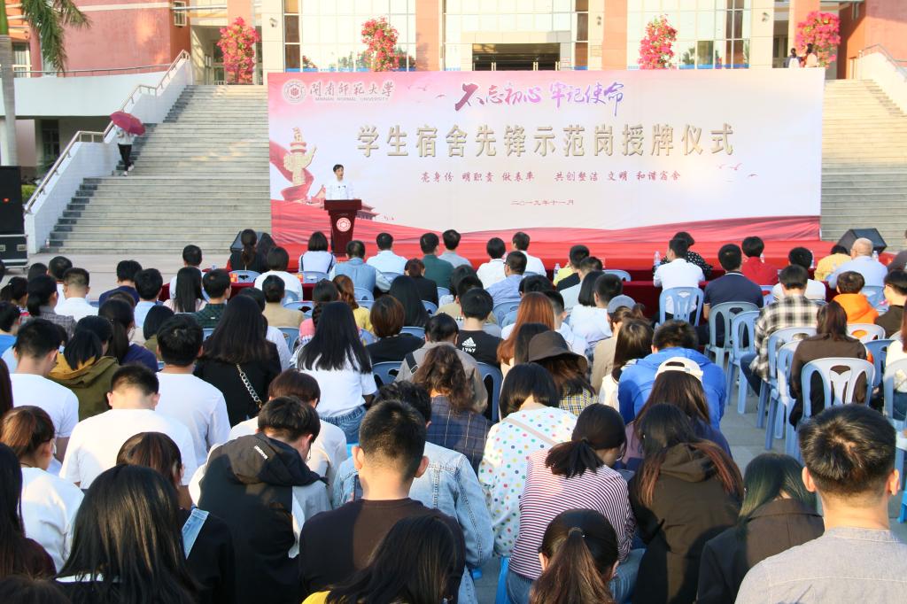 为推动“不忘初心、牢记使命”主题教育走深走实,引导学生党员、学生干部守初心、担使命,11月10日下午,登录入口在弦歌广场举行“不忘初心、牢记使命”学生宿舍先锋示范岗授牌仪式。校党委副书记钟发亮出席活动,学校组织部、宣传部、学工部、研究生处、后勤管理处、保卫处、团委等部门负责人,各二级学院分管学生工作党委副书记、全体辅导员、学生代表等参加授牌仪式。授牌仪式由学工部部长郑炎山主持。