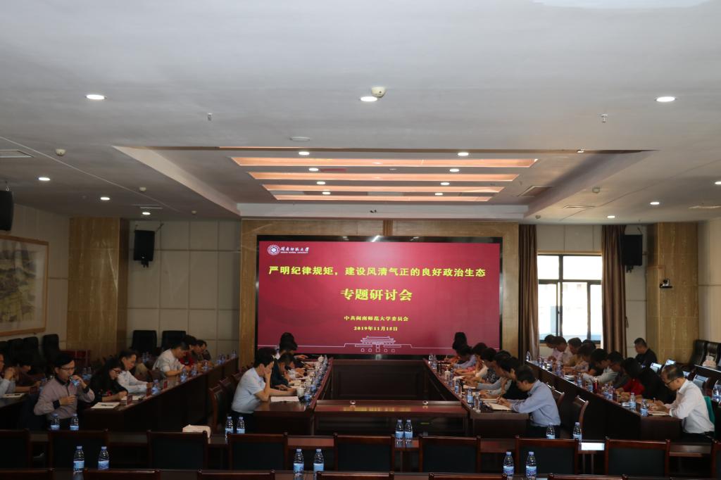 会上,校党委常委、副校长何绍福,党委常委、纪委书记黄来渊分别围绕研讨主题作重点发言。何绍福指出,党员领导干部要深刻领会中央严明纪律规矩的坚定决心,充分认识严明纪律规矩的重要意义,增强笃信践行的使命感和紧迫感,坚决把纪律规矩挺在前面,建设风清气正的良好政治生态。他强调,建设风清气正的良好政治生态必须严明纪律规矩,进一步增强纪律意识,把严明政治纪律放在首位,严格执行组织纪律;必须坚持正确用人导向,严格把好干部选用标准关、审批关;必须持之以恒抓作风建设,充分发挥领导干部示范带头作用,培育良好的校园风气;必须严格党内生活,坚持民主集中制,坚持开展批评和自我批评。