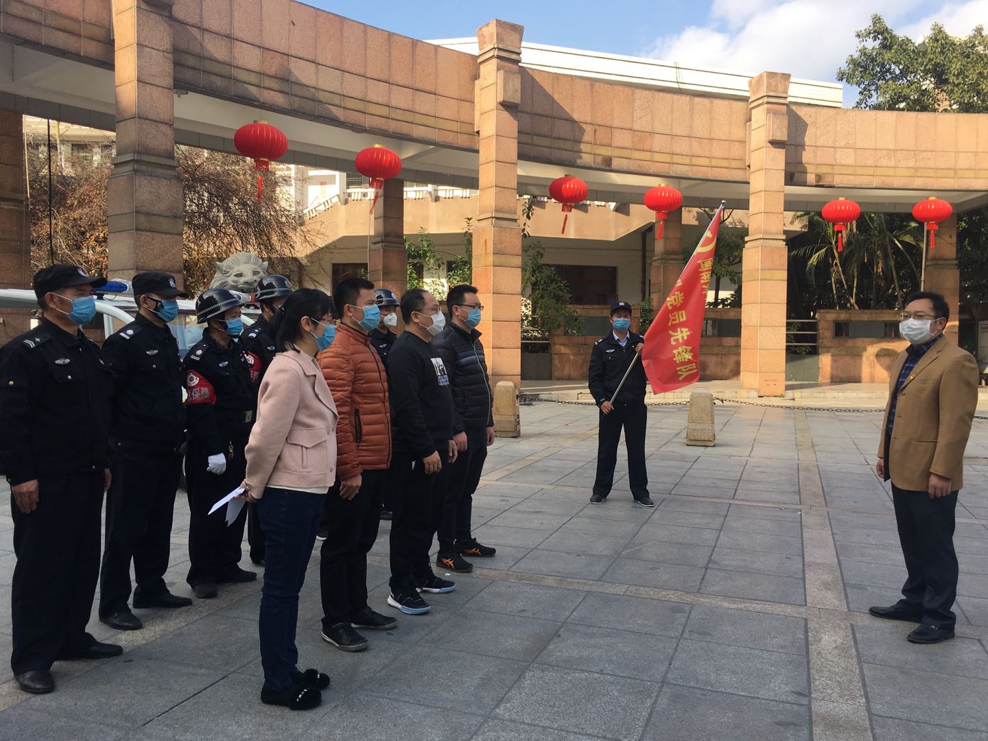 2月9日,校党委常委、副校长何绍福深入一线检查学校疫情防控工作,并为保卫处战“疫”党员先锋队授旗。