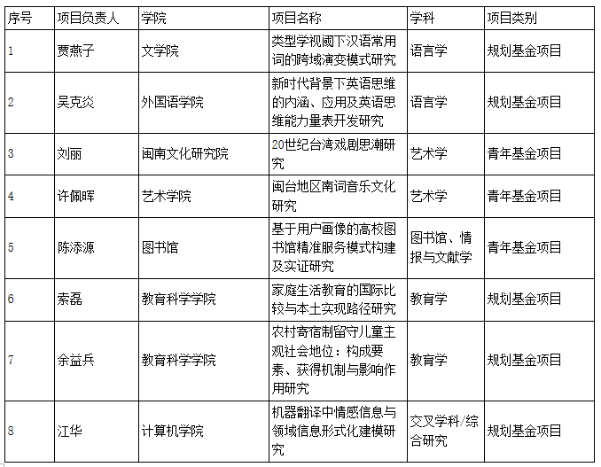 登录入口获得立项的8个项目来自文学院、外国语学院、闽南文化研究院、艺术学院、教育科学学院、计算机学院及图书馆,涵盖了语言学、艺术学、教育学、图书馆/情报与文献学、交叉学科/综合研究等5个学科领域,充分体现了登录入口人文社科研究的浓厚氛围和人文社科综合研究能力的不断提升。