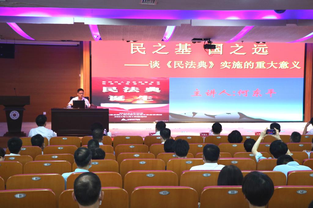 随后,法学与公共管理学院院长何东平教授作题为《民之基、国之远——谈<民法典>实施的重大意义》的专题报告。何东平从《民法典》的体例入手,分析了《民法典》制定过程的体例争议点以及《民法典》立法过程中体例演变的科学性和创新性,并通过丰富的案例阐释了《民法典》实施的重要意义。何东平指出,《民法典》的实施有利于固根本、稳预期、利长远;有利于推进全面依法治国,加快建设社会主义法治国家;有利于发展社会主义市场经济、巩固社会主义基本经济制度;有利于依法维护人民权益、推动我国人权事业发展;有利于推进国家治理体系和治理能力现代化。