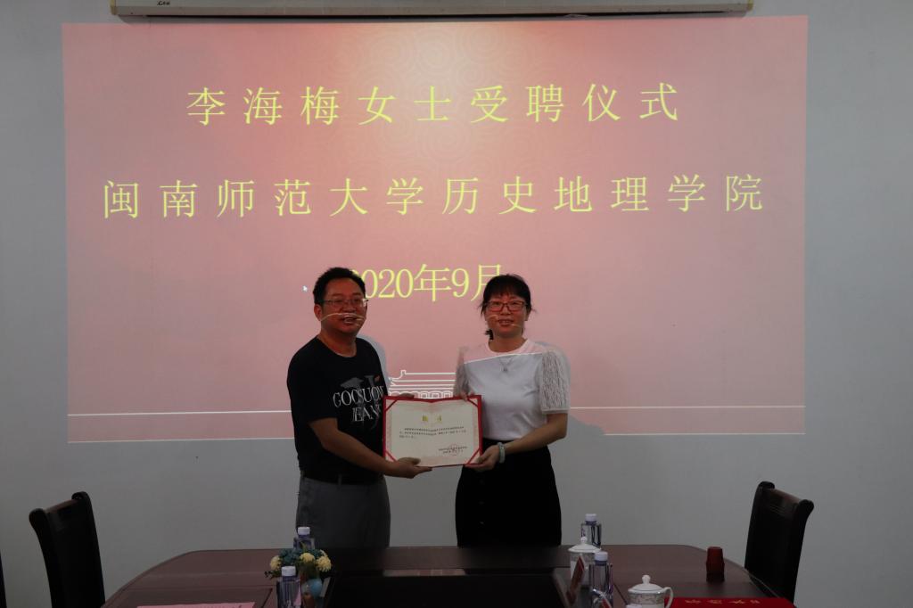 签约仪式上,何绍福向李海梅颁发聘书,聘任李海梅为历史地理学院历史学专业本科生、硕士研究生专业实践导师。