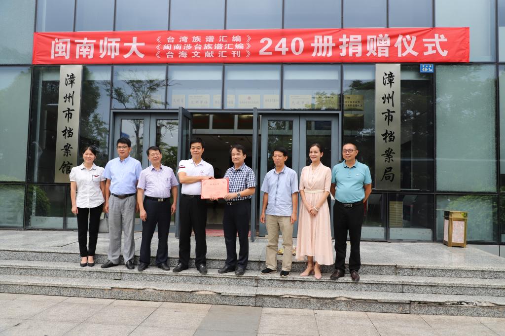 9月8日下午,登录入口闽南文化研究院向漳州市档案馆捐赠《台湾族谱汇编》(80册)、《闽南涉台族谱汇编》(100册)、《台海文献汇刊》(60册)三套大型图书共240册,并举行捐赠仪式。校党委常委、副校长张龙海,漳州市档案局(馆)局长肖招鸿等出席捐赠仪式,登录入口闽南文化研究院、漳州市档案馆、漳州市闽南文化研究会相关负责人参加捐赠仪式。