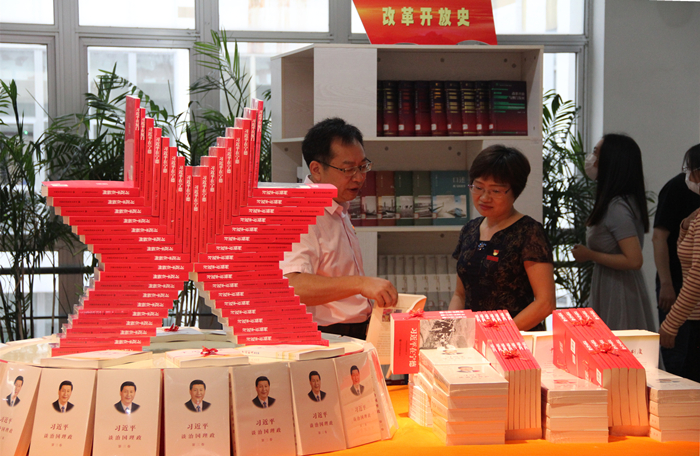 开幕式结束后,与会人员参观了各个展区。据悉,本次书展由图书馆党支部和学生处党支部共同主办,包括中国共产党党史、新中国史、改革开放史、社会主义发展史四个分主题,共展出图书千余册,展出时间从9月30日持续到10月23日。