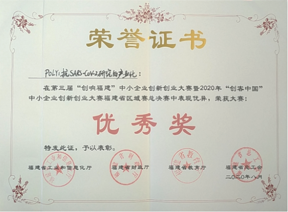 与此同时,今年8月,《POLY1抗新冠肺炎病毒研究与产业化研究》项目获得了工信部组织的2020年“创客中国”中小企业创新创业大赛福建省区域赛总决赛第五名;9月,该项目又以初创组唯一的生物医药项目入围第九届中国创新创业大赛(福建赛区)暨第八届福建创新创业大赛总决赛,获得第二名的优异成绩,并入围全国大赛。《科技MK体育/mksport体育·官方网站》专门对获奖团队进行深入采访,并在中国科技网、学习强国等平台进行宣传。