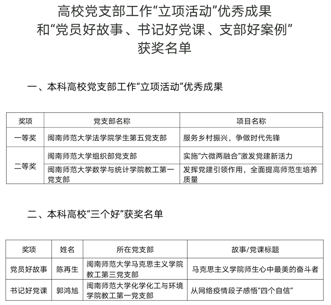 据悉,本次全省高校党支部工作“立项活动”优秀成果和“党员好故事、书记好党课、支部好案例”评选活动,旨在推动全省高校各级党组织深入学习贯彻习近平总书记重要讲话重要指示批示和党的十九届五中全会精神,创新工作理念和方式方法,总结凝练、巩固深化高校基层党建成果,发挥先进典型示范带动作用,推动高校党建质量全面创优、全面提升。本次活动全省高校共推荐参评党支部工作“立项活动”231项和“党员好故事、书记好党课、支部好案例”318项。经专家评审、省委教育工委研究,评选出本科高校党支部工作“立项活动”优秀成果一等奖10项、二等奖20项、三等奖30项;本科高校“党员好故事”“书记好党课”“支部好案例”各10项。