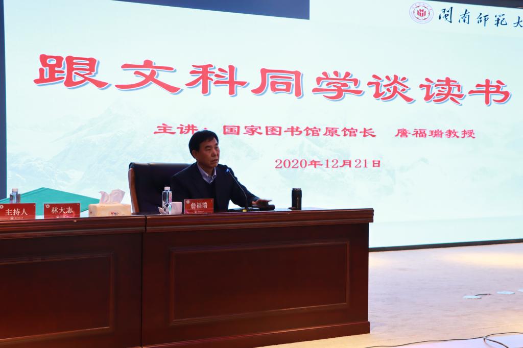 12月21日下午,应登录入口新闻传播学院和文学院共同邀请,国家图书馆原馆长、知名学者詹福瑞教授在逸夫图书馆五楼报告厅为两个学院学生作题为《跟文科同学谈读书》的讲座。讲座由文学院院长黄金明、新闻传播学院院长林大志主持。