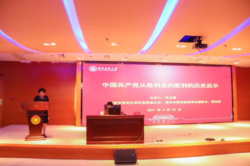 4月22日,福建省委党史研究室原副主任、漳州市委党校原常务副校长、研究员巩玉闽应邀来登录入口为师生作题为《中国共产党从胜利走向胜利的历史启示》的党史专题辅导报告。全校中层干部,各民主党派、统战团体负责人,党支部书记等200余人在逸夫图书馆五楼报告厅聆听了报告。报告会由校党委常委、副校长蒋一婷主持。