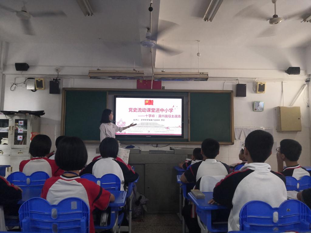 为推进党史学习教育走深走实,近日,文学院组织开展党史流动课堂走进中小学活动。31名实习支教学生党员化身红色讲解员,在云霄、平和、长泰等地共16个中小学,利用课堂讲述党史故事,让革命先辈的故事走出文本,走进中小学课堂。