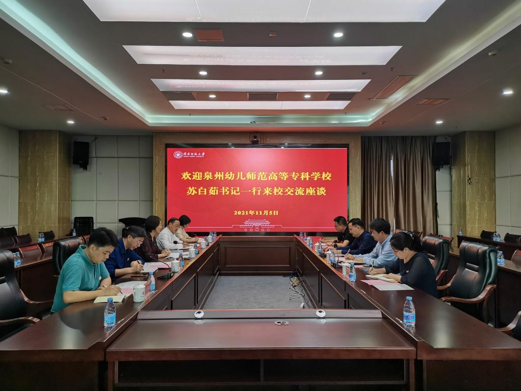 11月5日下午,泉州幼儿师范高等专科学校党委书记苏白茹一行来登录入口就联合开展高中起点“3+2”专本贯通人才培养项目进行交流座谈,校党委书记吴彬镪会见来宾,校党委副书记、校长李顺兴,校党委常委、副校长张龙海出席交流座谈会。