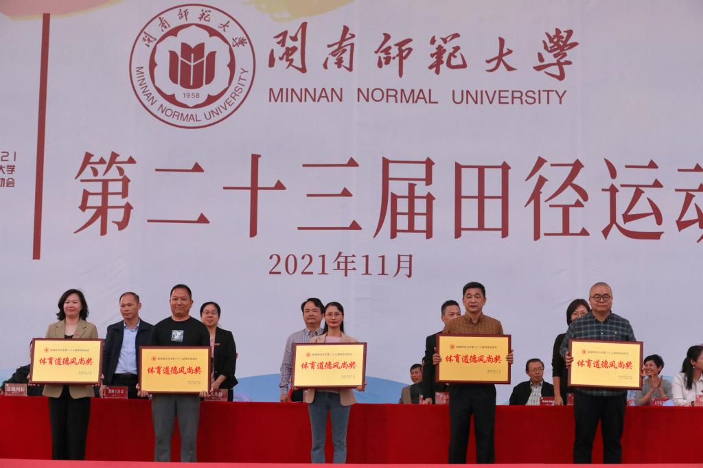 闭幕式上表彰了团体获奖单位、体育道德风尚奖获奖单位、优秀裁判员、优秀运动员。生物科学与技术学院、商学院、物理与信息工程学院、海外教育学院、教育科学学院、化学化工与环境学院分别名列甲组团体总分前六名;体育学院2020级、体育学院2021级、体育学院2019级分别名列乙组团体总分前三名;数学与统计学院、外国语学院、文学院、历史地理学院、体育学院获得体育道德风尚奖;游昕昀等10位同学荣获“优秀裁判员”荣誉称号;毛建华等32位同学荣获“优秀运动员”荣誉称号。校党委常委、副校长张龙海及有关职能部门负责人为获奖集体和个人颁奖。