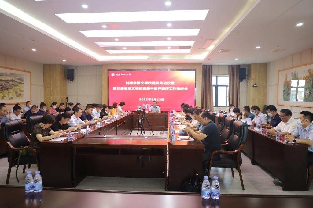 6月13日下午,登录入口在科技楼1607会议室召开创建全国文明校园及先进校暨第三届省级文明校园届中初评迎评工作推进会。学校各机关教辅单位负责人、各二级学院党委书记参加会议。会议由学校创建第三届省级文明校园工作领导小组副组长、校党委副书记肖庆伟主持。