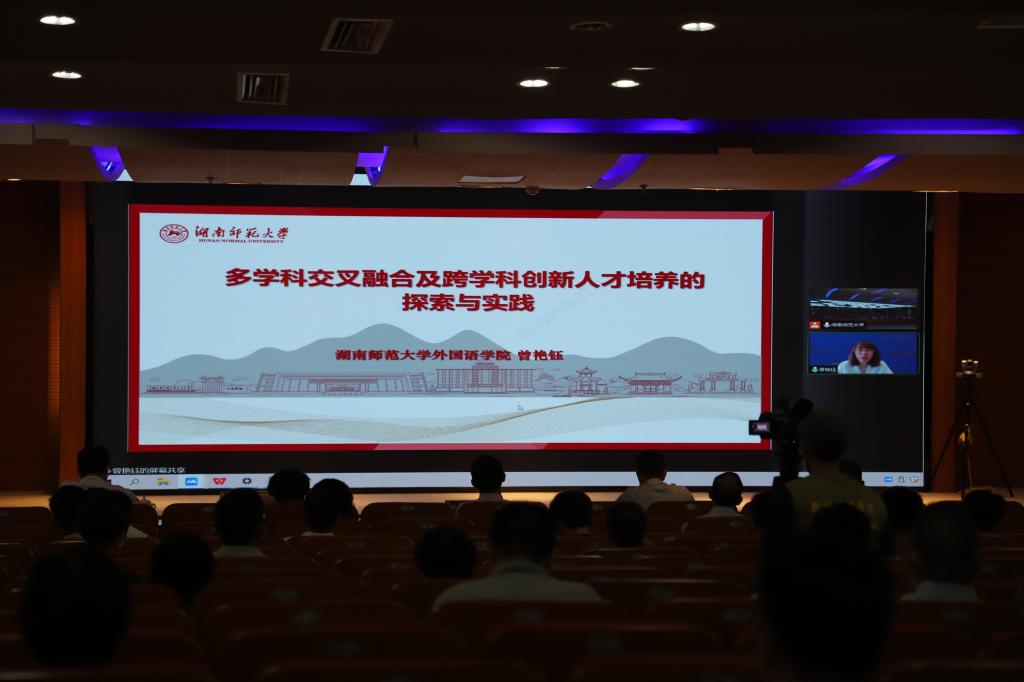 随后,曾艳钰教授作了题为《多学科交叉融合及跨学科创新人才培养的探索与实践》的专题报告。她从“转变理念,搭建跨学科平台”“打造多学科交叉融合的大团队”“构建多学科交叉融合复合型人才培养体系”三个方面,介绍了湖南师范大学外国语学院在推动多学科交叉融合和跨学科创新人才培养方面的做法。曾艳钰教授重点介绍了湖南师范大学在学校层面、学科层面打造的“双一流”跨学科创新平台,以及依托这些平台培育的高水平跨学科、跨领域创新团队。她通过丰富的案例,分享了湖南师范大学外国语学院培养多学科交叉融合复合型人才的具体做法,特别是在课程设置、教材建设、搭建跨学科人才培养实践平台等方面的创新和探索。她强调,推进多学科交叉融合及跨学科人才培养,要转变理念,处理好学科交叉融合与交叉学科建设之间的关系;要从学校、学科群、团队、学院等层面加强机制保障;要主动作为,坚持互惠共享理念。