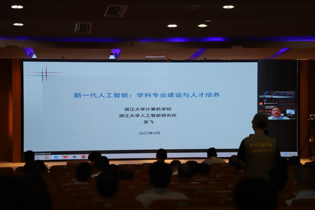 吴飞教授首先作了题为《新一代人工智能:学科专业建设与人才培养》的专题报告。他阐述了人工智能的诞生以及新一代人工智能的崛起、国务院印发《新一代人工智能发展规划》的背景、国家部委和各省份推出的促进新一代人工智能发展的举措,以及人工智能所具有的学科交叉内禀的特点和人工智能正在引发的科学研究范式变革。他介绍了当前我国人工智能学科专业建设和人才培养的基本情况,重点介绍了计算机领域本科教育教学改革试点工作计划的核心内容、课程设置,深入讲解了浙江大学在提升人工智能领域教育教学水平和夯实优势方面的做法,特别是“教材、课程和实训平台”三位一体交叉人才培养、“AI+X微专业”模式的探索。吴飞教授表示,人工智能是引领新一轮科技革命、产业变革和社会发展的战略性技术,具有溢出带动性很强的头雁效应,将在使能技术、赋能社会方面作出积极贡献。