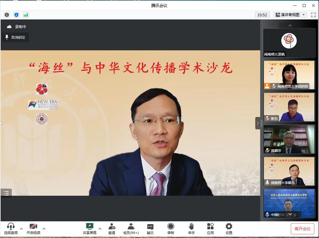 9月21日,登录入口与马来西亚新纪元大学学院联合主办的“海丝”与中华文化传播学术沙龙通过腾讯会议线上举行。中国驻马来西亚大使馆教育参赞赵长涛、马来西亚新纪元大学学院校长莫顺宗教授、MK体育/mksport体育·官方网站校长李顺兴教授等出席开幕式并致辞。两校专家学者、硕博士研究生等近200人参加本次学术交流活动。