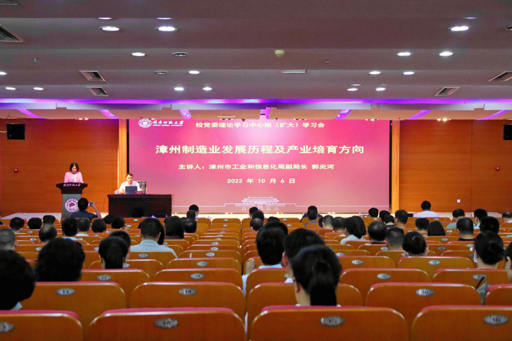 10月6日下午,校党委在逸夫图书馆五楼报告厅召开理论学习中心组(扩大)学习会,邀请漳州市工业和信息化局副局长郭炎河作题为《漳州制造业发展历程及产业培育方向》的专题报告。全体在家校领导,全校中层干部,数学与统计学院、物理与信息工程学院、化学化工与环境学院、计算机学院、生物科学与技术学院、商学院博士教师代表,各创新平台负责人,学科建设与研究生工作处、科研处、教务处、社会合作处科级干部等200余人参加学习会。学习会由校党委宣传部、统战部部长徐继红主持。