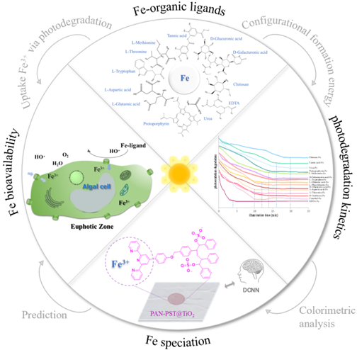 据光降解动力学差异,即不同铁有机络合物光降解过程中游离Fe(III)离子的释放顺序和速率(EDTA>氨基酸、单糖酸>尿素>酚类>多糖),可区分dFe形态。为验证有机铁络合物的稳定性和了解其光降解动力学原理,Fe(III)与有机配体作用能可通过第一原理计算其形成能获得。同时,基于藻类吸收的dFe生物利用性评估与基于光解动力学的铁形态分析相关系数高达0.85,因此可通过金属形态评估dFe的生物可利用性。该研究可为河流、湖泊和沿海水域的真光层中基于金属生物可利用性的金属形态分析方法提供全新思路。