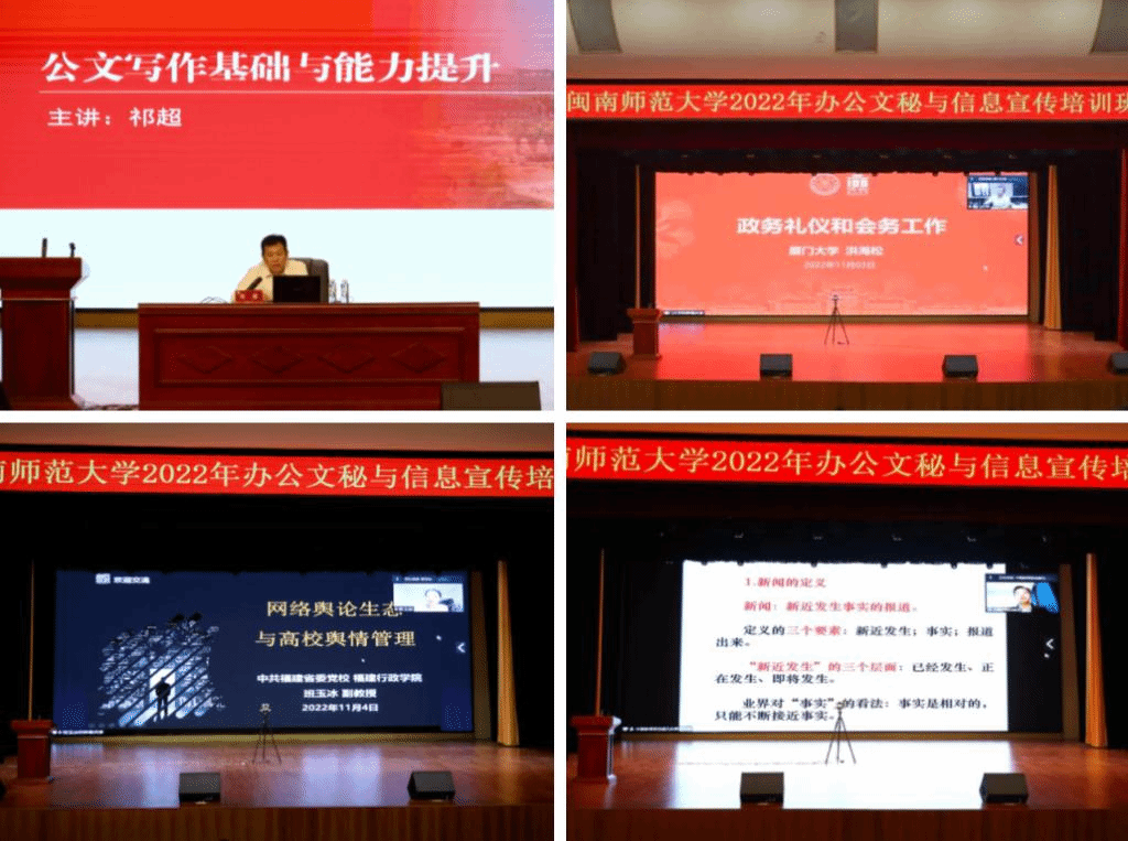 培训期间,厦门大学、福建省委党校、中国教育报刊社等单位专家学者,围绕公文写作基础与能力提升、政务礼仪和会务工作、网络意识形态和网络舆情应对处置、教育新闻素材挖掘与写作等方面开展专题报告。专家们系统讲解了公文写作的基础知识,会议记录、会议纪要、公文文稿的撰写技巧;高校公务接待、会议管理及重要活动安排的工作要求;全媒体环境下高校网络舆情管理的策略重点及突发事件处置中的媒体沟通技巧;教育新闻的发现与写作技巧等。报告内容丰富、案例详实、深入浅出,与会人员纷纷表示受益匪浅。