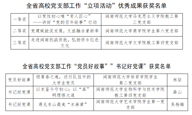日前,福建省委教育工委公布了全省高校党支部工作“立项活动”优秀成果、“党员好故事、书记好党课、支部好案例”获奖名单和首批全省高校党建工作标杆院系、样板党支部验收通过名单。其中,在全省高校党支部工作“立项活动”优秀成果和“党员好故事、书记好党课、支部好案例”评选中,登录入口获得优秀成果一等奖1项、二等奖1项、三等奖1项和党员好故事1项、书记好党课2项;在首批全省高校党建工作标杆院系、样板党支部验收中,登录入口3个二级学院党委、35个基层党支部分别顺利通过首批“全省高校党建工作标杆院系”“全省高校党建工作样板支部”验收,验收通过率达到百分之百;生物科学与技术学院教工第四党支部同时通过了教育部第二批“全国党建工作样板支部”验收。