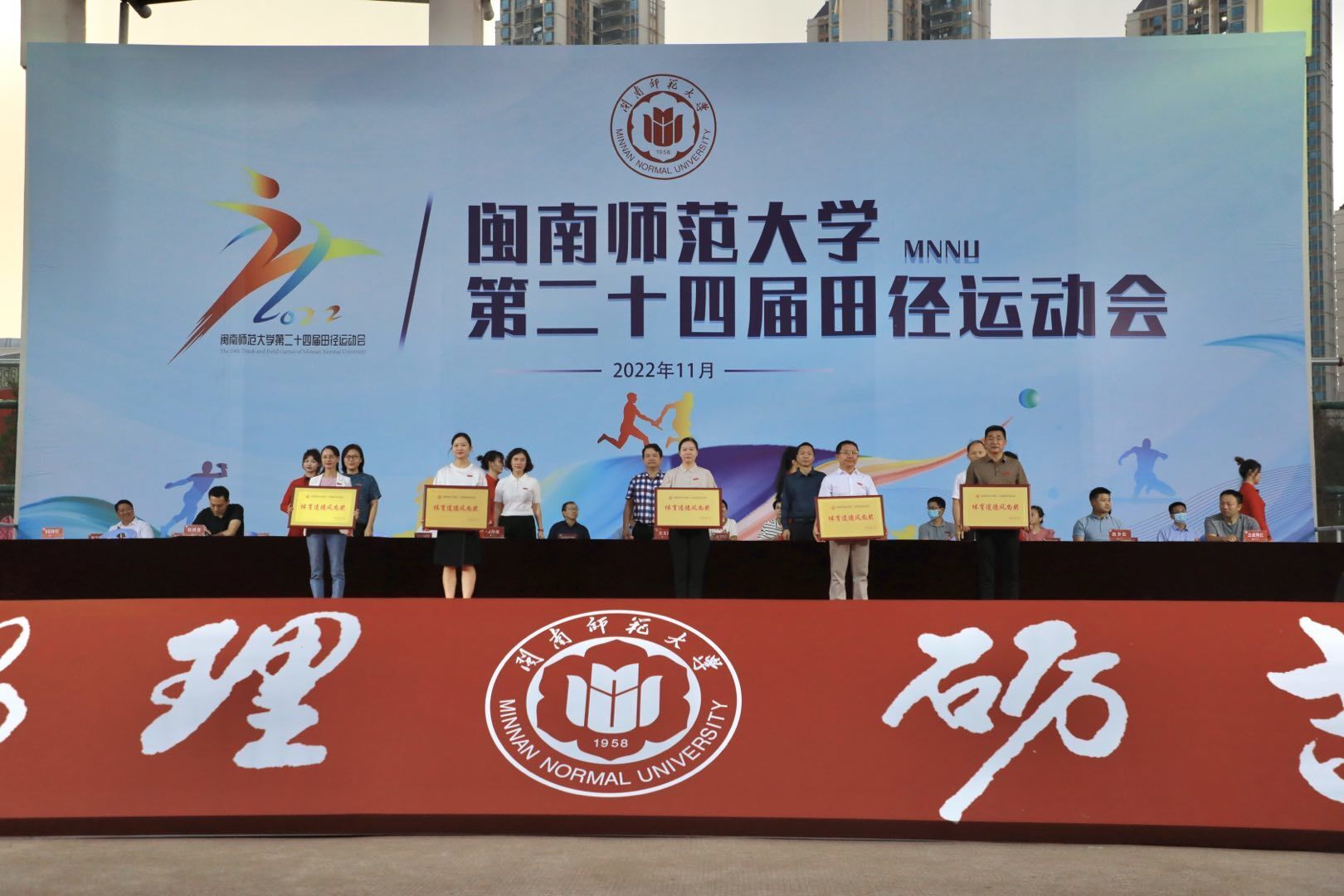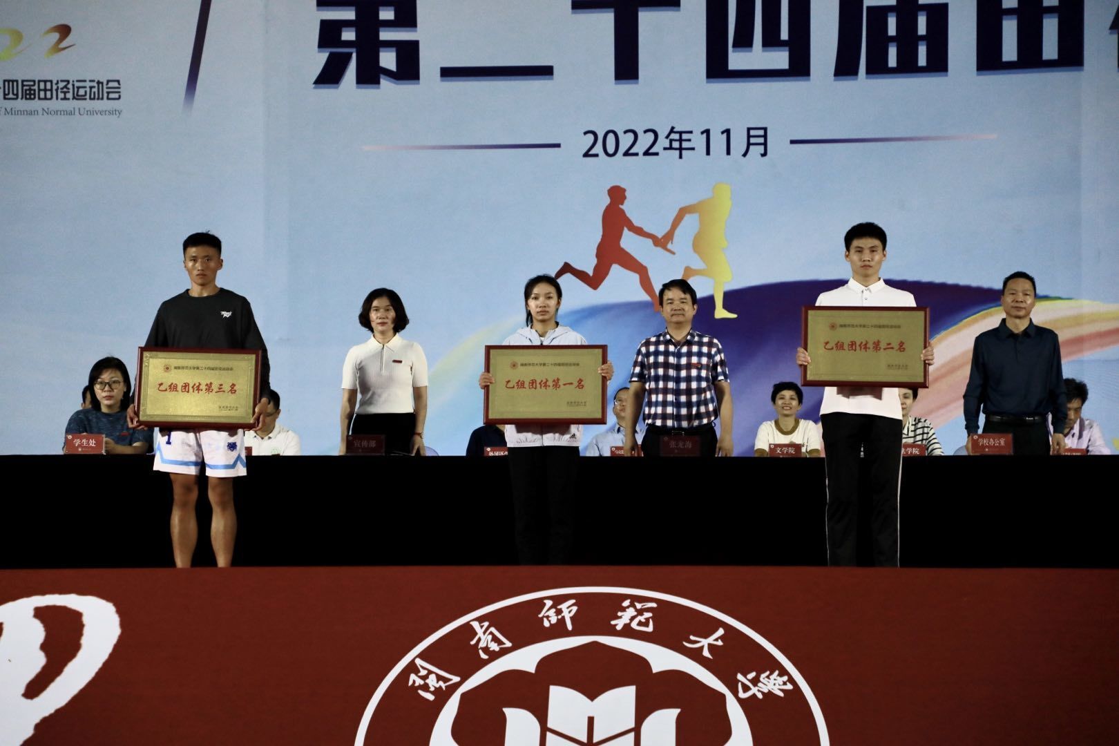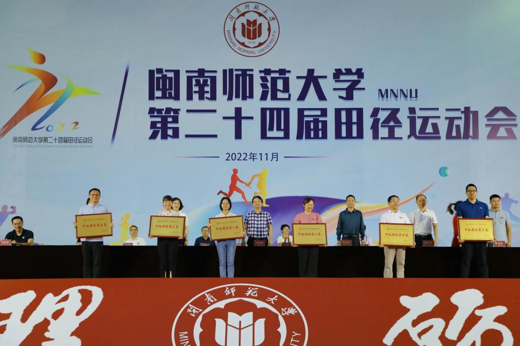 闭幕式上表彰了团体获奖单位、体育道德风尚奖获奖单位、优秀裁判员、优秀运动员。物理与信息工程学院、教育科学学院、生物科学与技术学院、数学与统计学院、商学院、化学化工与环境学院分别获得甲组团体总分前六名;体育学院2022级、2021级、2020级体育专业学生分别获乙组团体总分前三名;体育学院、数学与统计学院、计算机学院、外国语学院、文学院获体育道德风尚奖;陈泽森等15位同学获评“优秀裁判员”;林璐菲等32位同学获评“优秀运动员”。张龙海及有关职能部门负责人为获奖集体和个人颁奖。