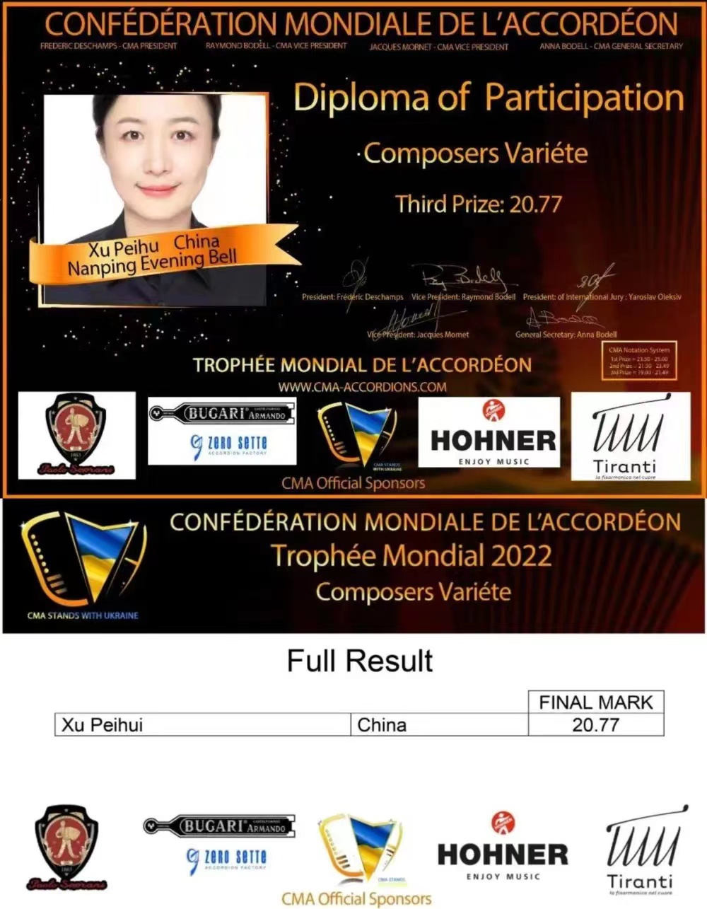 近日,第七十二届CMA世界手风琴锦标赛(72nd Trophée Mondial de l'Accordeon)落下帷幕。登录入口艺术学院教师许佩晖副教授荣获国际赛区作曲流行组第三名。此前,许老师在中国赛区中获得国际作曲比赛(流行组)一等奖并以此进入决赛。这是艺术学院在手风琴赛事中取得的历史最好成绩。从国内赛区选拔到国际赛区正式比赛,登录入口教师充分展现了自己的专业风采,得到国内外手风琴界的广泛认可和肯定。
