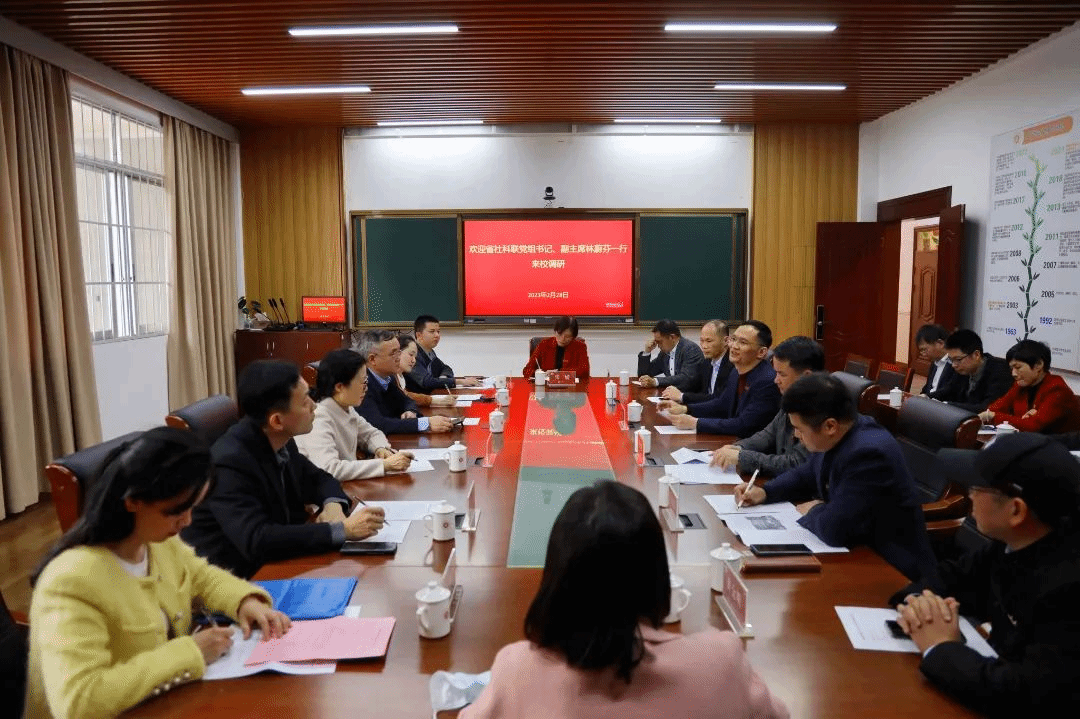 2月28日,省社科联党组书记、副主席林蔚芬一行来登录入口调研。调研座谈会在文学院博东110会议室举行,校党委副书记、校长李顺兴,党委常委、副校长张龙海出席。会议由张龙海主持。