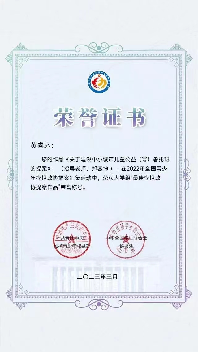 近日,由共青团中央维护青少年权益部、中华全国学生联合会秘书处联合开展的2022年全国青少年模拟政协提案征集活动评审结果公布,由法学院团委组织申报的提案作品在大学组表现优异,1项作品获评全国“最佳模拟政协提案作品”(全省高校共两项),1项作品获评全国“优秀模拟政协提案作品”。