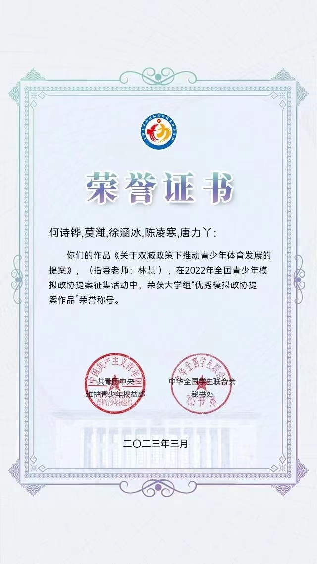 由郑容坤老师指导,黄睿冰同学的提案作品《关于建设中小城市儿童公益(寒)暑托班的提案》聚焦中小城市家庭寒暑假期间儿童“看护难”问题,调研儿童公益(寒)暑托班实际运营情况,提出完善相关政策,创设“一对一”帮扶体系等相关建议,作品获评全国“最佳模拟政协提案作品”。由林慧老师指导,何诗铧等同学的提案作品《关于双减政策下推动青少年体育发展的提案》关注青少年体育教育现状,从招录要求、合作渠道、法律规范以及教育模式四个方面提出具体解决方案,作品获评全国“优秀模拟政协提案作品”。