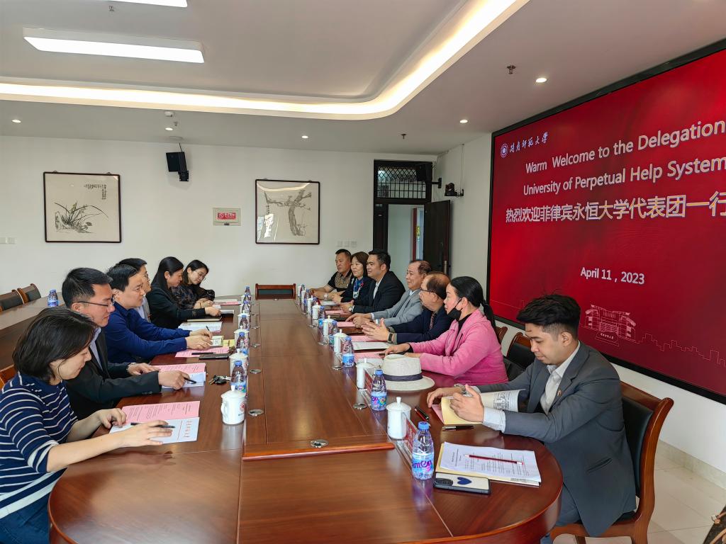 4月11日上午,菲律宾永恒大学研究生院院长爱德华多·齐亚尔西塔教授一行来校访问交流,校党委常委、副校长林致远在科技信息楼会见来宾,并举行座谈。人事处、海外教育学院、艺术学院负责人参加会见。
