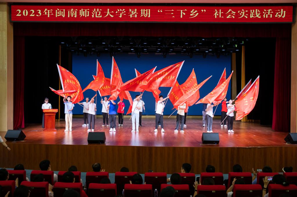 2022年暑期“三下乡”社会实践全国优秀团队指导教师、物理与信息工程学院团委书记杨超男作典型经验发言。2023年暑期“三下乡”社会实践国家重点团队、文学院推普助力乡村振兴社会实践团成员苏埼同学代表全体实践团队成员发言。2023年暑期“三下乡”社会实践团队学生代表、体育学院陈俊杰同学带领实践队员进行宣誓。