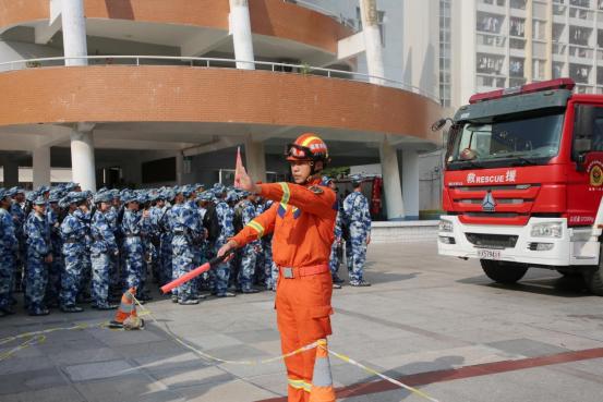 在北江滨校区,组织了消防自救与安全疏散演练。在应急疏散警报声中,同学们循着应急疏散通道,按照口诀要求,弯腰、低身、捂住口鼻,穿越翻腾的浓烟,紧张有序、有条不紊地撤离宿舍,快速转移至安全地带。消防官兵现场向同学们介绍宿舍防火基本知识,讲解灭火方法和实用技巧,模拟搜救受伤人员,并向师生演示高空水枪灭火作业。