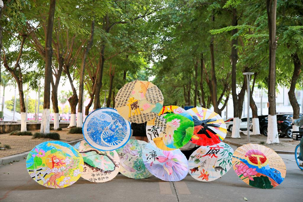 25组主题鲜明、富有创意巧思的油纸伞从近300份参赛作品中脱颖而出。其中,以“向老虎伸出的手”为主体的伞面,体现着坚决打击贪污分子,建设廉洁社会,弘扬廉洁风气的主题思想;将莲花与传统书法相呼应,号召我们要自觉坚持继承发扬中华优秀传统文化,弘扬清廉之风;用著名清官包拯的脸谱形象作为主图,缕缕金色祥云从他的袖口钻出,展现“两袖清风”的清官形象……一张张油纸伞在校园里形成了一道美丽独特的风景线。