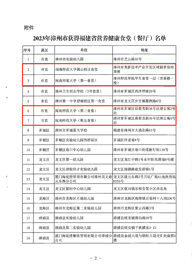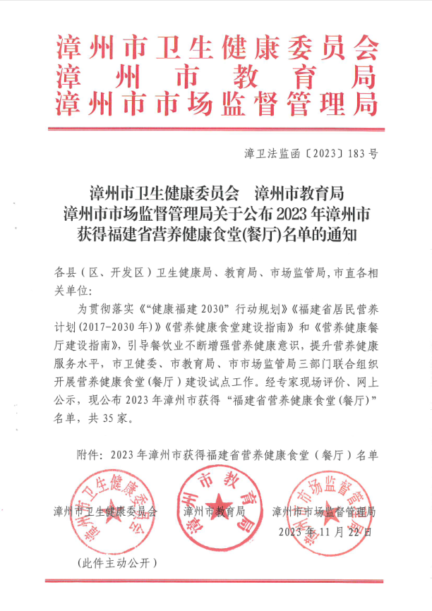 日前,漳州市卫生健康委员会、漳州市教育局、漳州市市场监督管理局公布了2023年漳州市获得“福建省营养健康食堂(餐厅)”名单,共35家。登录入口有4家食堂(圆山校区食堂、第一食堂、第三食堂、第五食堂)入选此次福建省营养健康食堂。