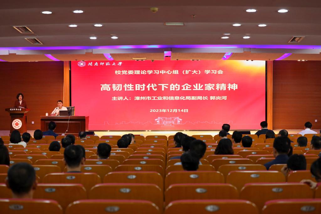 12月14日下午,校党委在逸夫图书馆五楼报告厅召开理论学习中心组(扩大)学习会,邀请漳州市工业和信息化局副局长郭炎河作题为《高韧性时代下的企业家精神》的专题报告。全体在家校领导,全校中层干部,数学与统计学院、物理与信息工程学院、化学化工与环境学院、计算机学院、生物科学与技术学院、商学院博士教师代表,各创新平台负责人,学科建设与研究生工作处、教务处、科研处、社会合作处科级干部等200余人参加学习会。学习会由校党委宣传部、统战部部长徐继红主持。