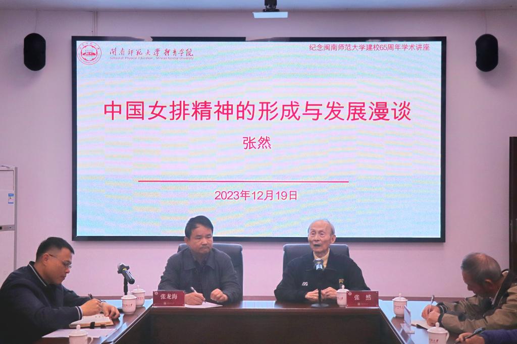 张然先生介绍了他少年时代接触排球、青年时代入选国家队为国征战、中年时代从事教练工作培养输送人才、耄耋之年仍为排球事业做贡献以及推动排球基地落户漳州等人生经历,分享了自己多年的执教、科研心得。他从女排精神的形成与发展、如何弘扬传承女排精神进行了重点阐释,深刻剖析了中国女排“祖国至上、团结协作、顽强拼搏、永不言败 ”的伟大精神。