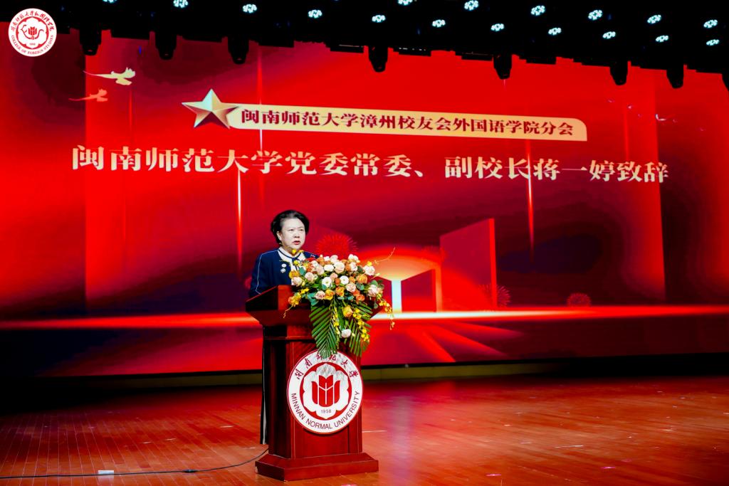 蒋一婷在讲话中表示,学校取得的跨越式发展和长足进步凝聚了各级校友们的智慧与辛勤付出,外国语学院培养的各行各业校友为教育事业和经济社会发展做出了积极贡献,为母校赢得良好的社会声誉。期待外国语学院分会与学校总会充分联动,用心用情用力做好平台建设,促进校友与母校双向奔赴、共同成就。希望广大校友关心支持学院、学校的事业,为学校发展建设贡献智慧和力量。