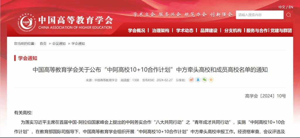 近日,中国高等教育学会公布“中阿高校10+10合作计划”中方成员高校名单,登录入口入选“文明对话”领域合作计划中方成员高校。