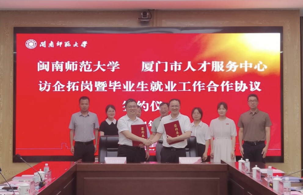 林贵东和厦门市人才服务中心办公室主任陈万华分别代表双方签订《校地访企拓岗暨毕业生就业工作合作协议》。