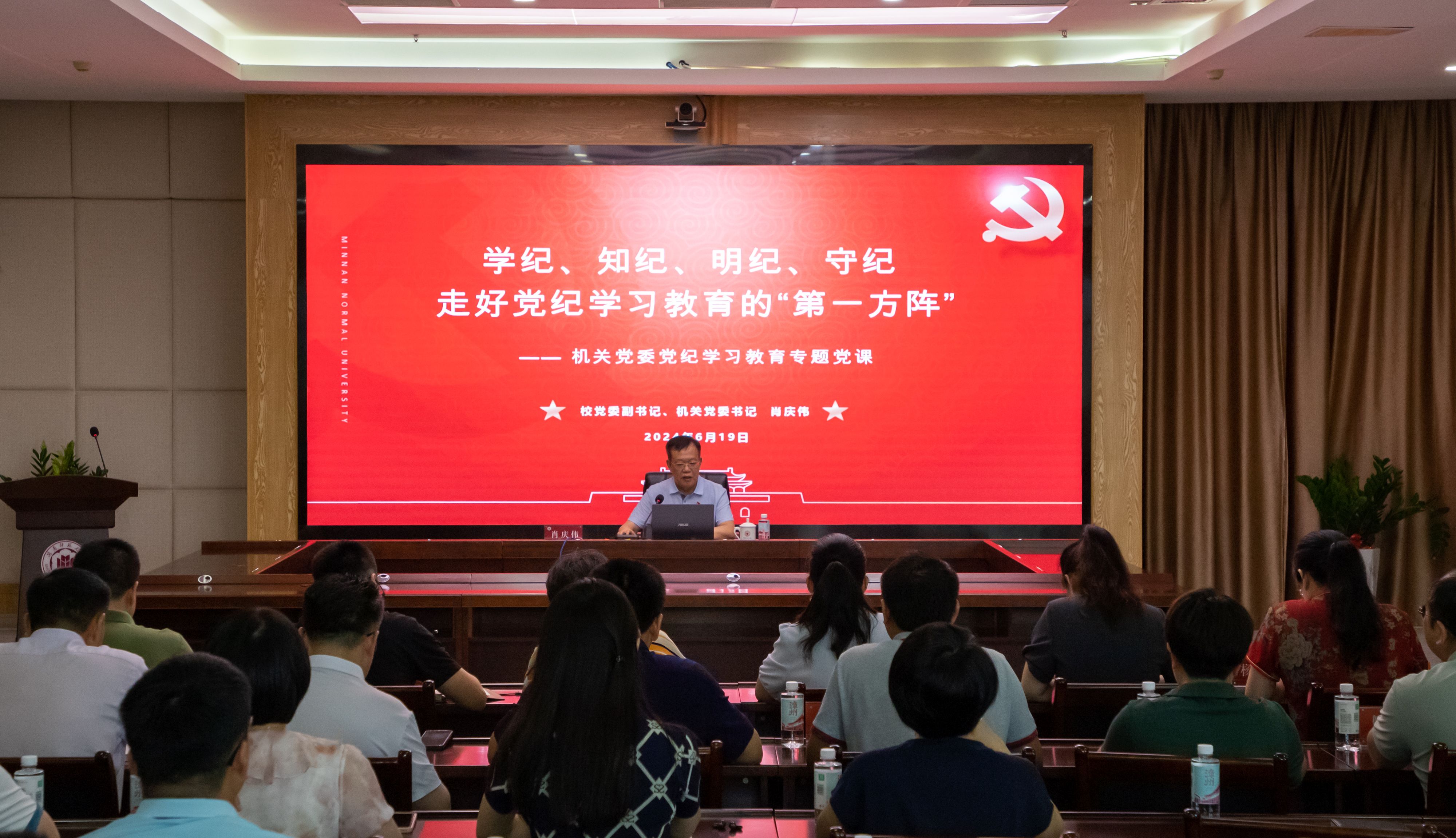 为推动学校党纪学习教育走深走实,6月19日下午,校党委副书记、机关党委书记肖庆伟以《学纪、知纪、明纪、守纪 走好党纪学习教育的“第一方阵”》为题,为机关教辅单位、联系学院以及“青马工程”青年干部培训班的党员干部讲授党纪学习教育专题党课。党课由校党委组织部部长、机关党委副书记赵丽霞主持。