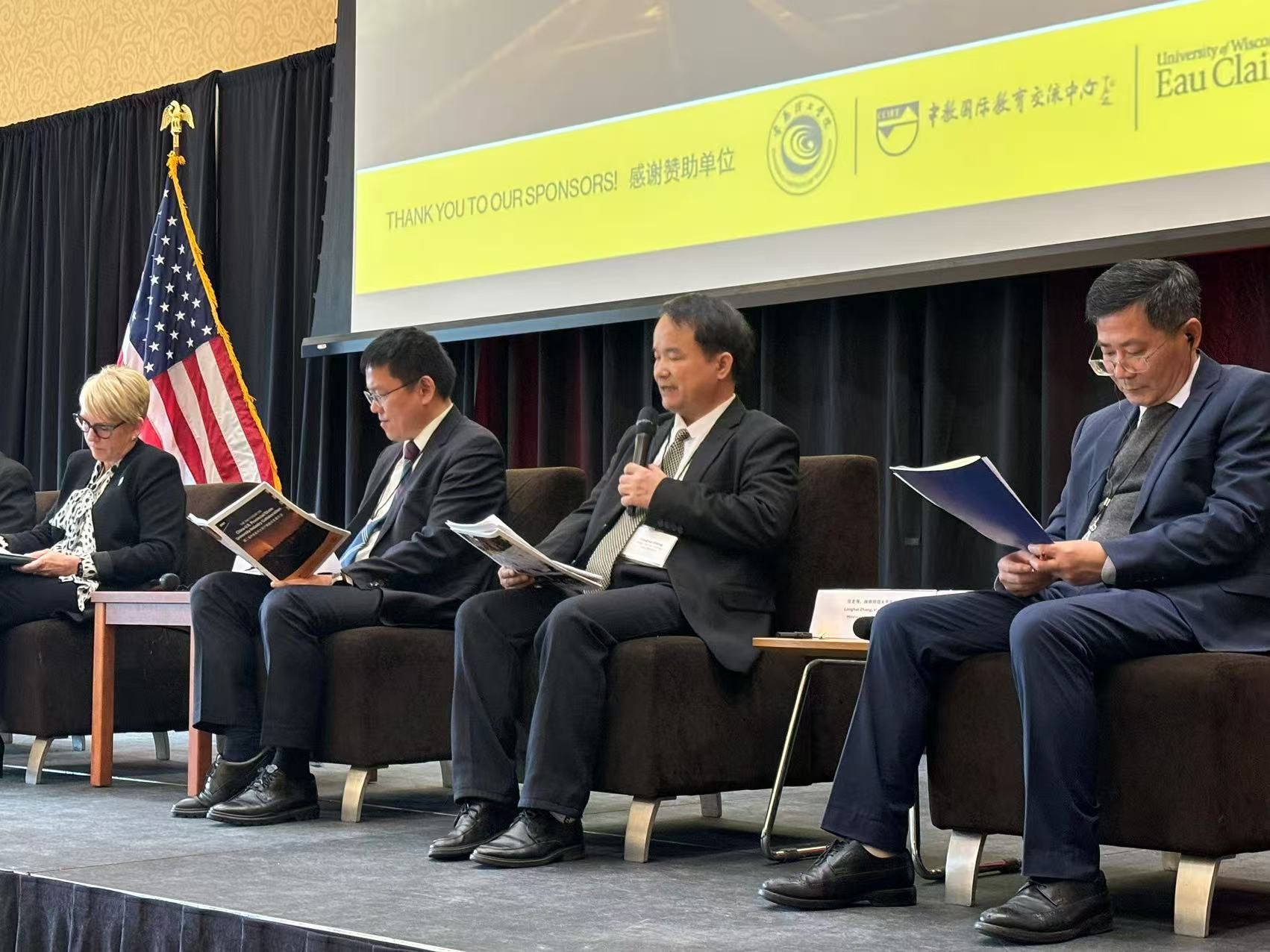 会议期间,张龙海与美国威斯康星大学斯托特分校、美国圣克劳德州立大学、南京工程学院代表共同担任大会主题研讨嘉宾,围绕校企合作如何促进大学服务地方使命,创新大学发展路径;大学、产业和区域经济三者如何协同发展,支持大学为地方经济的未来发展培养人才;中美省州大学如何与企业携手合作,共同应对当今世界面临气候变化、医疗卫生、跨国犯罪等许多挑战等问题展开主题研讨。